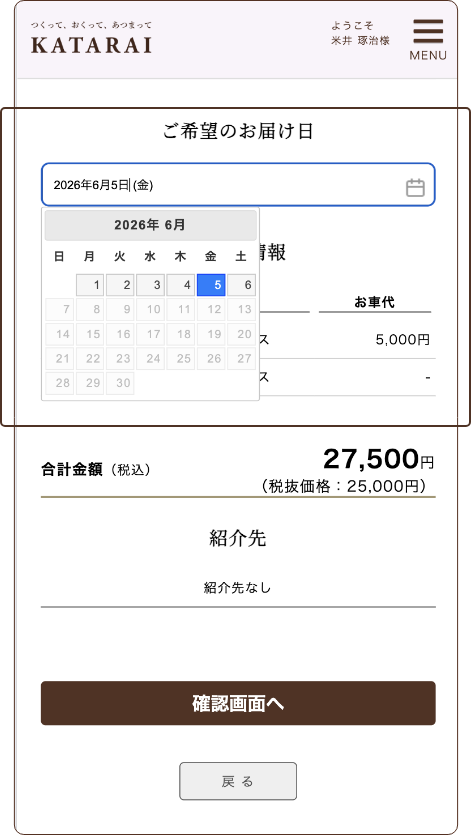 お届け先の確認画面に遷移します。