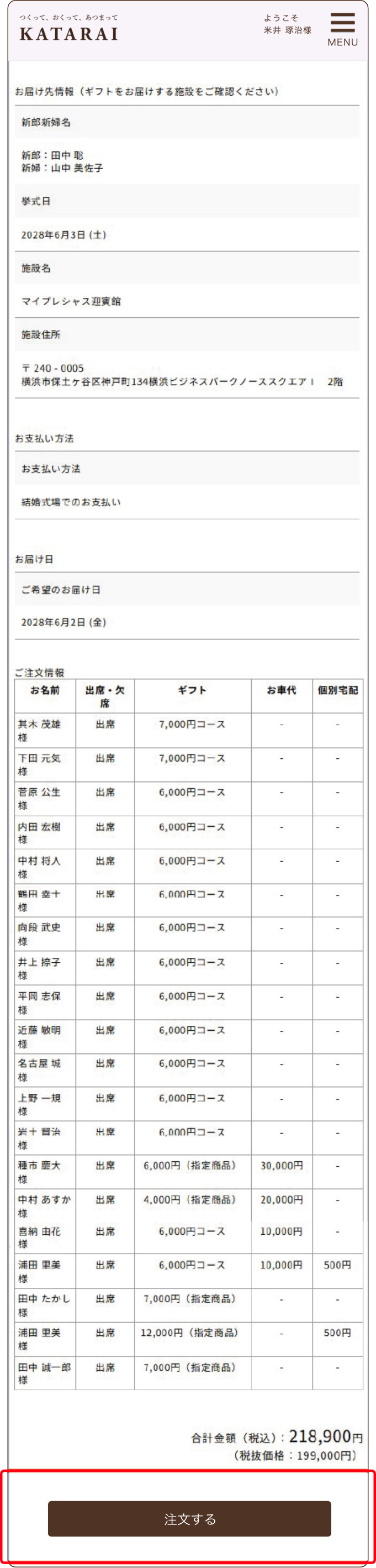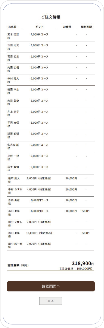 参列者様の過不足がないかを確認し、注文ボタンを押します。